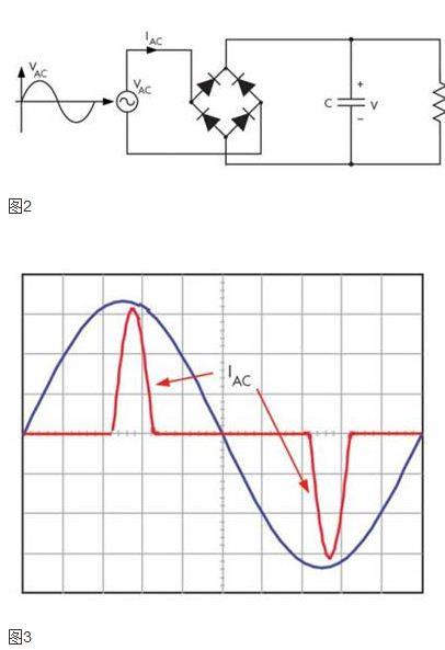 不過,許多電子系統(tǒng)的負(fù)載都需要交流到直流的轉(zhuǎn)換。在這種情況下,典型電源的電源線上的負(fù)載由一個(gè)驅(qū)動(dòng)電容的橋式二極管組成(圖2)。它是電源線的非線性負(fù)載,因?yàn)榇藰蚴秸髌鞯膬蓚(gè)二極管都位于輸入交流電源線電壓的正半周期或負(fù)半周期的直接電源通路中。此非線性負(fù)載僅在正弦電源線電壓的峰值期間汲取電源線電流,這樣會(huì)產(chǎn)生“多峰”輸入電源線電流,從而引起電源線諧波(圖3)。