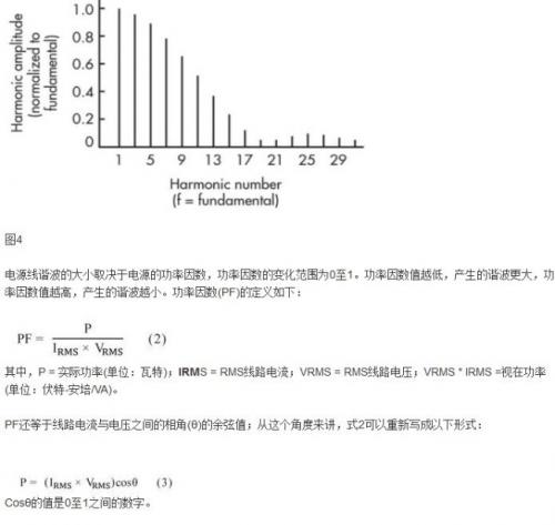 非線性負(fù)載可使諧波大小與線路頻率下的基本諧波電流具有可比性。圖4顯示了相對(duì)于線路頻率下的基本諧波大小進(jìn)行標(biāo)準(zhǔn)化的高階諧波電流大小。不過,只有圖1中給出的在與線路頻率相同的頻率下且與電源線電壓同相的諧波電流(在此案例中為線路頻率下的基本諧波)對(duì)提供給負(fù)載的平均功率起作用。這些諧波電流會(huì)影響同一電力線上的其他設(shè)備的工作情況。