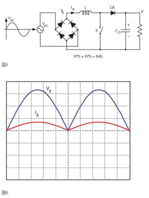許多PFC電路都采用升壓轉(zhuǎn)換器。傳統(tǒng)的PFC升壓轉(zhuǎn)換器中的一個(gè)限制因素是它只能由整流后的交流電源線供電,而這種電源線涉及兩級(jí)功率處理(圖5)。轉(zhuǎn)換器產(chǎn)生的波形更好地說明了這個(gè)問題(圖6)。此外,無法通過簡(jiǎn)單有效的方法在傳統(tǒng)升壓轉(zhuǎn)換器中引入隔離。