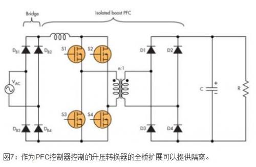 采用升壓轉(zhuǎn)換器的全橋擴(kuò)展(然后作為PFC轉(zhuǎn)換器進(jìn)行控制)是一種引入隔離的方法(圖7)。不過,這種方法需要在初級(jí)增加四個(gè)晶體管,在次級(jí)增加四個(gè)二極管整流器(晶體管和整流器均在100kHz的開關(guān)頻率下工作),從而增加了復(fù)雜性。此外,四個(gè)增加的二極管位于以50/60Hz的線路頻率工作的輸入橋式整流器中。