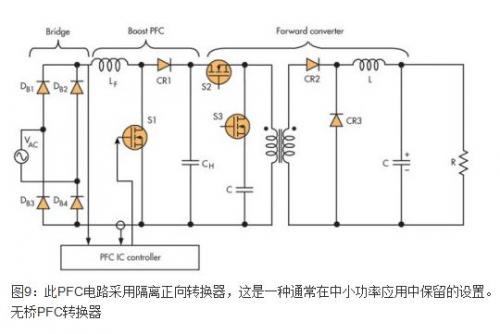 要實(shí)現(xiàn)1kW或1kW以上的功率,設(shè)計(jì)工程師經(jīng)常采用三級(jí)方法(圖8)。在圖8中,標(biāo)準(zhǔn)升壓PFC轉(zhuǎn)換器和隔離降壓轉(zhuǎn)換器位于輸入的橋式整流器之后。這總共需要14個(gè)開關(guān)。其中至少六個(gè)開關(guān)為高壓開關(guān),這樣就進(jìn)一步降低了效率,增加了成本。盡管如此,在使用最好開關(guān)器件的情況下,最高效率能夠達(dá)到90%左右,該頻率仍比兩級(jí)方法的效率要高。