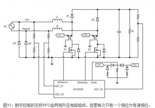 如今的大多數(shù)數(shù)字功率控制器(比如TI的UCD3020)都具有集成式功率控制外設(shè)和功率管理內(nèi)核,包括數(shù)字環(huán)路補(bǔ)償器、快速模數(shù)轉(zhuǎn)換器(ADC)、帶內(nèi)置死區(qū)時(shí)間的高分辨率數(shù)字脈寬調(diào)制器(DPWM)、低功耗微控制器等。這些控制器支持無橋PFC等復(fù)雜的高性能電源設(shè)計(jì)。
