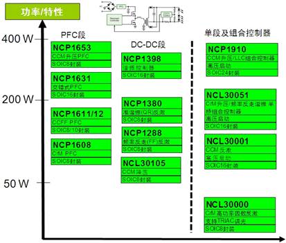 而在中等功率及大功率LED照明方面,安森美半導(dǎo)體同樣提供豐富的產(chǎn)品組合,滿足客戶不同應(yīng)用需求。其中既包含單段式及組合控制器,也包含傳統(tǒng)的兩段式(PFC段 + DC-DC段)控制器,覆蓋從15 W至400 W的寬廣功率范圍,如圖4所示。