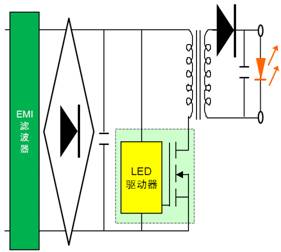 要將LED照明的節(jié)能功能發(fā)揮至最高,就需要高能效的LED驅(qū)動器。我們以LED燈泡為例,典型的LED燈泡包含LED陣列、驅(qū)動電路、散光罩、散熱片和螺旋燈頭等主要組件,見圖2的左半部分。就驅(qū)動電路而言,高能效LED驅(qū)動器IC無疑是其中的重點。圖2的右半部分顯示了典型的LED燈泡驅(qū)動電路,其中使用的是典型的獨立式LED驅(qū)動器。