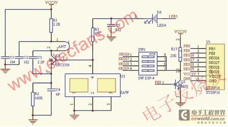 其中單片機(jī)采用的是 ST20P18,它是由臺(tái)灣矽創(chuàng)公司生產(chǎn)的一種CMOS工藝制造的低功耗低價(jià)位的8位單片機(jī),芯片內(nèi)部帶有振蕩器、系統(tǒng)定時(shí)器、看門狗定時(shí)計(jì)數(shù)器、LCD 控制器和16Kb的ROM以及192B的RAM。ST20P18控制的發(fā)碼電路原理圖如圖1所示,其發(fā)碼的基本原理為:系統(tǒng)利用撥碼開關(guān)來控制地址位和數(shù)據(jù)位(二進(jìn)制)信息的設(shè)置,再通過單片機(jī)運(yùn)行發(fā)碼程序進(jìn)行編碼并把地址位和數(shù)據(jù)位信息變換成一串脈沖信號(hào),最后由無線發(fā)射電路發(fā)射出去。具體實(shí)現(xiàn)為:單片機(jī)PB0口為發(fā)碼電路的數(shù)據(jù)輸出口和控制口,當(dāng)需要發(fā)碼的時(shí)候該口設(shè)置為輸出口,然后以脈沖的形式,按照相關(guān)的通信協(xié)議,輸出當(dāng)前所要發(fā)出的正確數(shù)據(jù)。反之,PB0口可復(fù)用為其他功能。PB0口的脈沖數(shù)據(jù)經(jīng)發(fā)碼電路調(diào)制并發(fā)射出433MHz的無線電波。