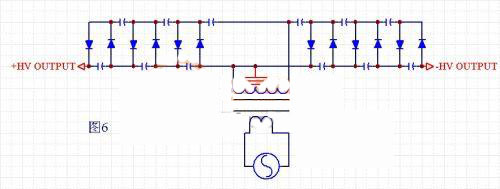 電路結(jié)構(gòu)見圖6,這其實(shí)是半波多倍壓電路的拓展結(jié)構(gòu)。可以同時(shí)的到正負(fù)高壓。當(dāng)然,如果把其中端高壓接地,把變壓器次級懸浮,也是可以的。這樣做的好處是,得到同樣的高壓,只需要有半波多倍壓一半的階數(shù)就可以得到了。那么電壓跌落和紋波都小很多。缺點(diǎn)是:假如采用某端高壓接地,高壓變壓器次級懸浮的方式,對高壓變壓器的絕緣要求很高。假如高壓變壓器次級接地的話,那么得到的是正負(fù)高壓,使用上不是很方便。
