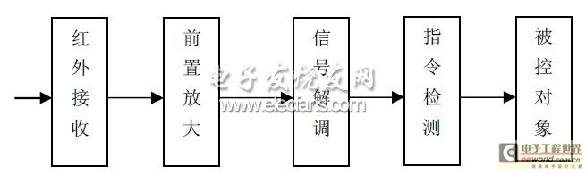 紅外接收器由紅外線接收器件、前置放大電路、信號解調(diào)電路、指令檢測電路組成,如圖2。當(dāng)紅外線接收器件接收到發(fā)射器的紅外線指令信號時,它將紅外光信號變?yōu)殡娦盘柌⑺腿肭爸梅糯笃鬟M(jìn)行放大,再經(jīng)解調(diào)器解調(diào)后由指令信號檢出電路將指令信號檢出,實(shí)現(xiàn)各種操作。