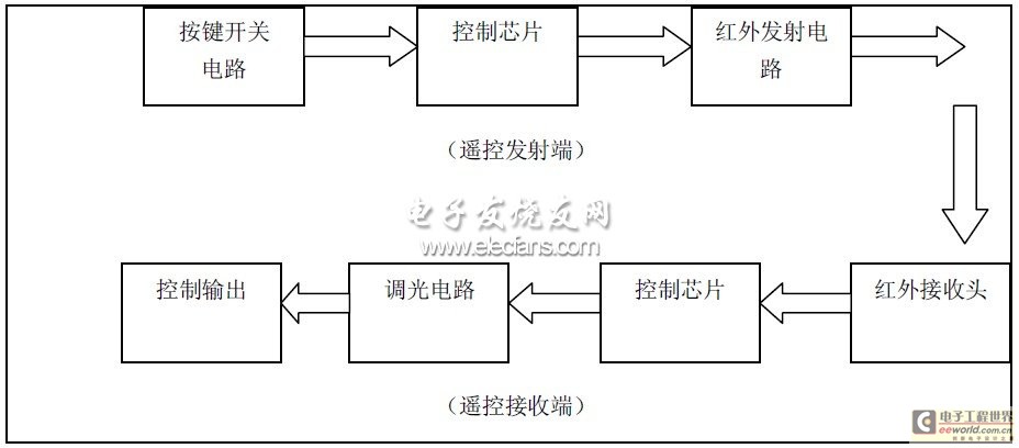 紅外遙控電路由發(fā)射電路和接收電路組成,發(fā)射部分由按鍵開關(guān)電路、控制芯片和紅外發(fā)射電路三部分組成。當(dāng)按下遙控按鈕時,單片機(jī)產(chǎn)生相應(yīng)的控制信號,經(jīng)紅外發(fā)射二極管發(fā)射出去。接收部分由紅外接收頭、控制芯片、調(diào)光電路組成,當(dāng)紅外接收器接收到控制脈沖后,經(jīng)單片機(jī)處理,判斷是否對電燈進(jìn)行調(diào)光或開關(guān),根據(jù)需要執(zhí)行相應(yīng)的操作,接收系統(tǒng)采用的是5 伏單電源電壓供電。如下圖所示: