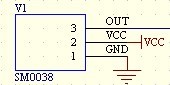 一般的紅外接收頭主要由集成電路外加阻容元件,紅外線接收管及濾波光片等組成,電路設(shè)計相對繁瑣,在實(shí)際應(yīng)用中不方便。而紅外遙控接收頭SM0038 集紅外接收管,前置放大解調(diào)等于一體,無外部電路,體積小,密封性好,靈敏度高,應(yīng)用簡單,用小功率紅外發(fā)射管發(fā)射信號接收距離達(dá)35 米,并且價格低廉。它僅有三條管腳,分別是電源正極、電源負(fù)極以及信號輸出端,其工作電壓在5V 左右,接收頻率為38kHz,它的主要功能包括放大,選頻,解調(diào)幾大部分,要求輸入信號需是已經(jīng)被調(diào)制的信號。從而使電路達(dá)到最簡化,靈敏度和抗干擾性都非常好,是一個接收紅外信號的理想裝置。如圖5 所示: