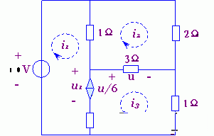 解之得:i1=3.6A, i2=2.8A, i3=4.4A,u=3(i3-i2)=4.8V,u1=11V。 |