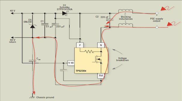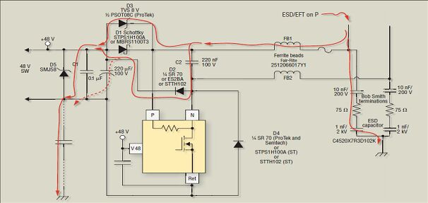 圖 4、本圖闡明了鐵氧體磁珠和鉗位二極管將正極ESD/EFT事件從TPS2384 芯片的P終端轉(zhuǎn)移到底座接地的電流路徑。