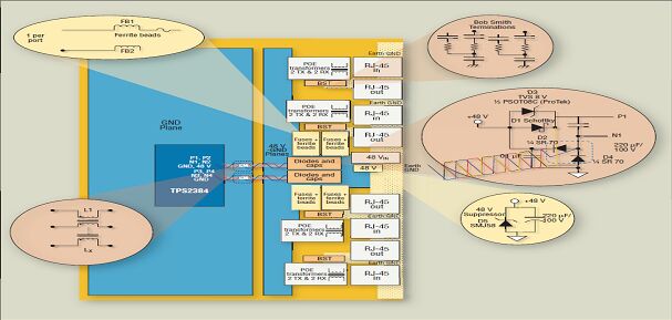 模擬可以提供在不同瞬態(tài)事件中可能的電壓大小的指示功能。線路對(duì)大地接地電容器上的最大可能電壓是 1kV,這表明選擇額定值為 2kV 的電容器是安全的。模擬還表明,應(yīng)用 8-kV ESD 時(shí),若同時(shí)存在 150-pF/330-HHM,則 BS 終端上 1-nF 電容器的電壓將小于 100V。對(duì)于Class 2 事件來說,在浪涌測(cè)試中,施加到該電容器的最高電壓是 1kV。同理,對(duì)于 10-nF 的電容器來說,200-V 的額定值也是安全的。不過,因?yàn)闆]有定義一個(gè) ESD 線纜放電模型,因此還沒有進(jìn)行過此類模擬。對(duì)于四端口的 PSE 來說,圖 6 顯示了一款推薦使用的電路板布局,其符合先前所述的所有設(shè)計(jì)指南。