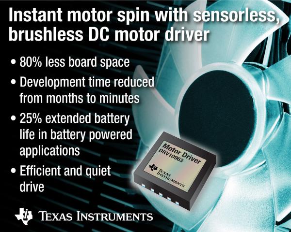 DRV10963 現(xiàn)已開(kāi)始供貨,采用支持裸露導(dǎo)熱焊盤的高效散熱 10 引腳、3 毫米 x 3 毫米 USON 封裝。
