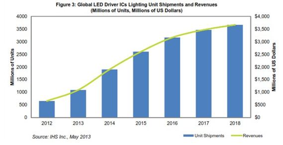今年照明將超過手機(jī),成為最大的LED驅(qū)動(dòng)IC領(lǐng)域,到2018年?duì)I業(yè)收入預(yù)計(jì)將達(dá)8.1億美元。