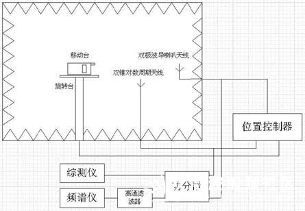 3. 通過暗室外的位置控制器調(diào)節(jié)旋轉(zhuǎn)臺上下位置和水平方向 360 度旋轉(zhuǎn)、調(diào)節(jié)雙錐對數(shù)周期天線或雙極波導(dǎo)喇叭天線的極化方向(調(diào)節(jié)和移動臺的極化方向一致),這樣在所有方向上找到移動臺輻射最大值(此時其諧波分量也是最大值),作為雜散發(fā)射的最后結(jié)果。
