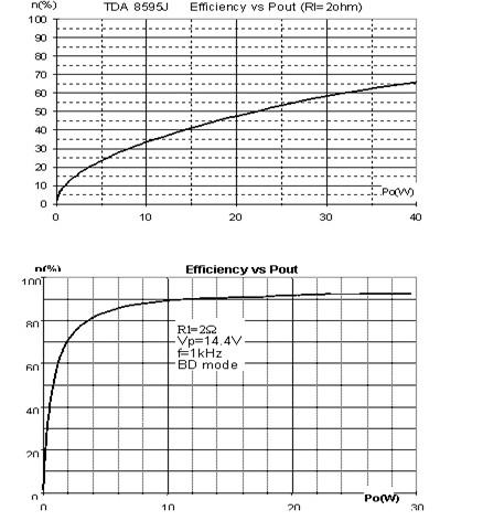圖1顯示的是在輸出功率范圍內(nèi),AB類放大器(圖1a)和D類音頻放大器(圖1b)的相對(duì)效率。
