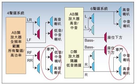 增加兩個(gè)聲道將解決幾個(gè)問題。首先,它允許用兩個(gè)新增聲道獨(dú)立地驅(qū)動(dòng)大功率的低音喇叭,以排除車門共振。另外,由於全部喇叭都不必工作在整個(gè)頻率范圍,還有可能實(shí)現(xiàn)高傳真音質(zhì)。