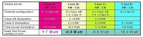 采用6個(gè)AB類放大器聲道將總共產(chǎn)生27W功耗,比車前單元一般認(rèn)為可承受的功耗高7W(見圖3, 情況A)。但若將AB和D類音頻放大器整合在一起,則即使僅采用兩個(gè)D類音頻放大器(最可能用於低音喇叭驅(qū)動(dòng)),也將滿足功耗預(yù)算。圖3的最下行顯示了 20W與該特定配置的整體功耗區(qū)別。