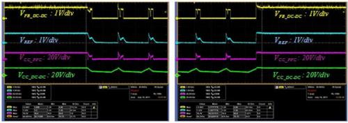 在無負(fù)載條件下,當(dāng)反激轉(zhuǎn)換器的反饋電壓下降時,PFC級的電源電壓被切斷,PFC控制器停止工作。圖2顯示負(fù)載從滿負(fù)載到無負(fù)載,再到滿負(fù)載過程 中的工作波形。一旦第二級反激轉(zhuǎn)換器進(jìn)入間歇工作,PFC級便進(jìn)入間歇工作模式,并與反激轉(zhuǎn)換器同步停止間歇工作模式。通過對PFC級執(zhí)行間歇工作,可以 消除可能引起潛在問題的大浪涌電流,并且大幅降低待機(jī)功耗。為了評測PFC級的間歇工作,使用FAN7930臨界導(dǎo)通模式PFC控制器、帶間歇工作功能的 準(zhǔn)諧振反激控制器FAN6300A以及所提議的PFC控制電路,設(shè)計了一個用于LED街燈的的120W(48V/2.5A) LEB-016演示線路板。如圖2所示,建議的電路工作出色。表1所示為在各種輸入線路電壓下的待機(jī)功耗測量值?梢宰C明:在寬泛的輸入范圍內(nèi),可以使待 機(jī)功耗降低80%以上。還可以在高線路輸入電壓下獲得低于0.3W的待機(jī)功耗。
