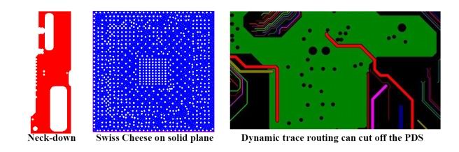 電源板層上有Swiss-Chess結(jié)構(gòu)、Neck-Down結(jié)構(gòu)和動態(tài)布線造成的板平面被分割等情況(圖1);電源板層上電流通過的器件管腳、過孔、焊球、C4凸點的數(shù)量不夠,電源平板厚度不足,電流通路不均衡等;系統(tǒng)設(shè)計需要低電壓、大電流,又有較緊的電壓浮動的范圍。