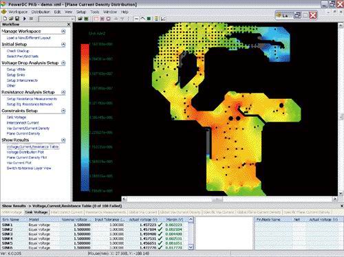 布線工程師、系統(tǒng)工程師、信號完整性工程師和電源設(shè)計工程師還可以將IR壓降分析結(jié)合在約束管理器(constraint manager)中,作為對PCB上每一個電源和地網(wǎng)表進(jìn)行設(shè)計規(guī)則核查的最終檢驗工具(DRC)。這種通過自動化軟件分析的設(shè)計流程可以避免靠目測,甚至經(jīng)驗所不能發(fā)現(xiàn)的復(fù)雜電源供電系統(tǒng)結(jié)構(gòu)上的布局布線問題。圖2展示了IR壓降分析可以準(zhǔn)確地指出一高性能PCB上電源供電系統(tǒng)中關(guān)鍵電壓電流的分布。