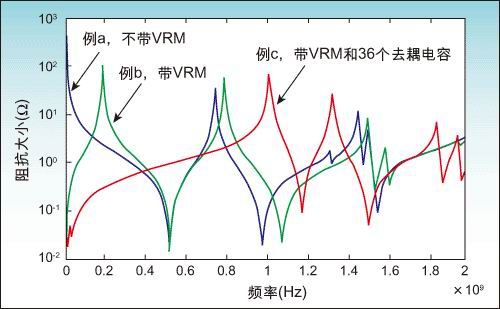 例子c的紅線,在板上放置了一些去耦電容后,那個200MHz的諧振峰被移到了很低的頻率處(<20MHz),并且諧振峰的峰值也降低了很多。第一個較強(qiáng)的諧振峰則出現(xiàn)在大約1GHz處。由此可見,通過在PCB上放置分立的去耦電容,電源供電系統(tǒng)在主要的工作頻率范圍內(nèi)可以實現(xiàn)較低的并且是平滑的交流阻抗響應(yīng)。因此,電源供電系統(tǒng)的噪聲也會很低。