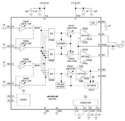 MAX97003音頻子系統(tǒng)集成了單聲道揚聲器放大器和立體聲耳機放大器。耳機和揚聲器放大器具有獨立的音量和開/關(guān)控制。其四個輸入可配置為兩個差分或四個單端輸入。