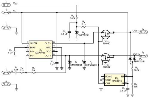 汽車電子產(chǎn)品的一個普遍要求是直接連接到配線裝置,必須能夠經(jīng)得起電池電壓的短路。雖然殘酷,但這項規(guī)定對可靠性與安全來說是必要的。一個需要這種保護的例子是用于汽車內(nèi)部產(chǎn)生間接噪聲的音頻放大器。雖然工作電壓為3.3或5v,低于電池電壓,但放大器必須能夠忍受滿電池電壓。還可以使用適合其他汽車電路中放大器的保護網(wǎng)絡(luò) (圖1)。一個雙N溝道場效應(yīng)管隔離從接線結(jié)點到另一端的高壓條件的放大器輸出。該場效應(yīng)管,Q1A 和Q1B,通常情況下是開著的;齊納擊穿二極管D4及其偏置元件驅(qū)動場效應(yīng)管的門限大約達到11V。雙二極管D3提供OR二極管連接到每個輸出的直流電壓,從而產(chǎn)生電壓控制分流調(diào)節(jié)器IC2的輸出。電路保護IC1,1.4W的AB類放大器適于為汽車電子提供聲音警告和指示。