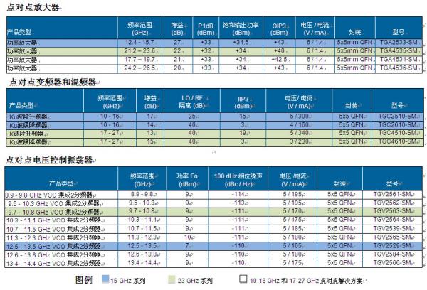 TriQuint本次推出的新產(chǎn)品包括高性能封裝的放大器、上變頻器 / 下變頻器、電壓控制振蕩器 (VCO) 以及其它附加裝置,能夠支持從10 到27 GHz范圍內(nèi)的點對點射頻需求。