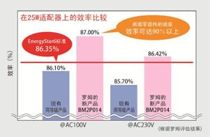 為了提高效率,采用了羅姆自產(chǎn)的高效超級結(jié)MOSFET;為了最大限度發(fā)揮出內(nèi)置MOSFET的性能,徹底優(yōu)化了驅(qū)動(dòng)電路。效率符合Energy Star 6.0要求的86.35%,用于AC100V、25W的適配器時(shí),與一般產(chǎn)品相比,僅僅替換IC本身就能實(shí)現(xiàn)87%以上的效率。通過進(jìn)一步優(yōu)化外圍部件,效率還可改善到90%以上。