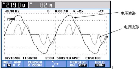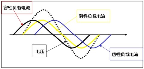 虛線代表電壓波形,我們的市電波形正常為幅值220V,頻率50HZ的正弦交流電,當(dāng)負(fù)載電流的波形也是50HZ的正弦波形時,我們稱此類負(fù)載為線性負(fù)載,當(dāng)電流波形相位與電壓一致時,我們稱為阻性負(fù)載,如圖1的黃色線,如常見的白幟燈、電路、電熱水器。當(dāng)電流相位超前于電壓時,我們稱此類負(fù)載為容性負(fù)載,如圖1中的黑色線,純?nèi)菪载?fù)載比較少,如一般配電室常用的無功補償柜就是純?nèi)菪载?fù)載。當(dāng)負(fù)載電流相位滯后于電壓波形時,此類負(fù)載稱為感性負(fù)載,如圖1的藍(lán)色線,常見感性負(fù)載如電動機、變壓器、電感式鎮(zhèn)流器日光燈。