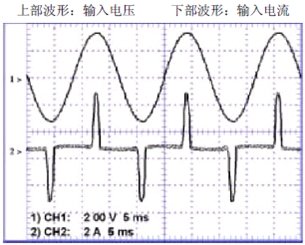 可以看出其電流波形相對電壓的正弦波形相差很大,圖3是一般三相電源常見的變頻器輸入電流波形: