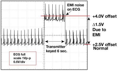 1    1.5 英尺以外的發(fā)射器(f = 470 MHz, P= 0.5W)開(kāi)啟和關(guān)閉時(shí)ECG 診斷設(shè)備的心臟檢查結(jié)果