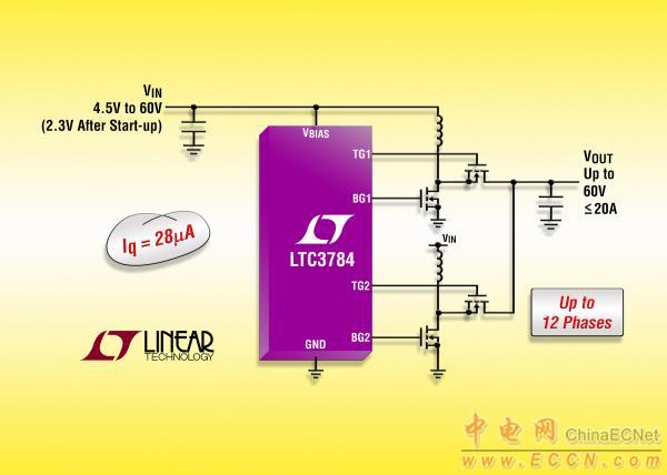 Linear推出大功率兩相單輸出同步升壓型 DC/DC 控制器 LTC3784,該器件采用高效率 N 溝道 MOSFET 取代了整流升壓二極管。這款器件在無需任何散熱器的情況下,可從 12V 輸入以高達 97% 的效率產(chǎn)生 24V/12A 輸出。LTC3784 啟動時于 4.5V 至 60V 的輸入電壓范圍內(nèi)工作,啟動后可保持輸入低至 2.3VIN 工作,并且能調(diào)節(jié)輸出電壓至高達 60V。
