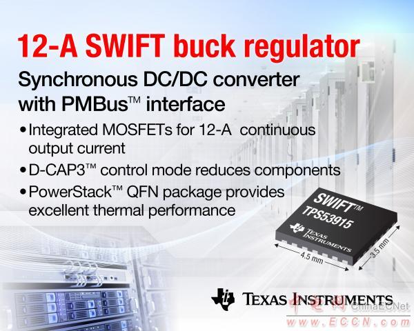 TI宣布推出支持 PMBus 接口的業(yè)界最小型 12A 同步降壓 DC/DC 轉(zhuǎn)換器。該 SWIFTTPS53915 采用微小型 PowerStack™ QFN 封裝并集成 NexFET™ MOSFETS,可在空間有限的高電源密度應(yīng)用中驅(qū)動(dòng) ASIC,能夠充分滿足有線及無線通信、企業(yè)/云計(jì)算以及存儲(chǔ)系統(tǒng)等各種市場(chǎng)需求。TPS53915 與 TI 獲獎(jiǎng)型 WEBENCH® 在線設(shè)計(jì)工具聯(lián)用,可簡(jiǎn)化功率轉(zhuǎn)換,加速設(shè)計(jì)進(jìn)程。