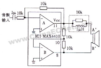 在BTL結(jié)構(gòu),IC1 MAX4410的右通道用作主放大器A,它設(shè)定器件增益,驅(qū)動(dòng)揚(yáng)聲器的一端A,,并給左通道B提供信號(hào),左通道B配置成單位增益的跟隨器B,對(duì)右通道的輸出進(jìn)行反相后驅(qū)動(dòng)揚(yáng)聲器的另外一端B,。為保持低失真和良好的匹配,需用精密電阻設(shè)定左通道的增益。