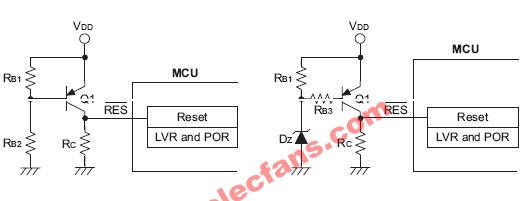 當內(nèi)建的低電壓復位電路的電壓與應用規(guī)格不同時,可選用外部三極管低電壓復位電路。