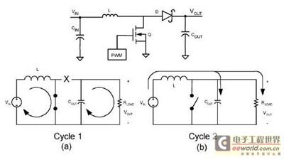 2)減小諧波回路面積,對(duì) LM3478,如圖,MOS 管開(kāi)通時(shí),Cin,L 和 MOS 構(gòu)成一個(gè)回路對(duì)電感充電,請(qǐng)看圖 2(a)的 Cycle1。MOS 管關(guān)斷時(shí),Cin,L,D,Cout 構(gòu)成另一個(gè)回路對(duì)電感放電,請(qǐng)看圖 2(b)中的 Cycle2。對(duì)于二極管 D,交替工作在正向?qū)ê头聪蚪刂沟臓顟B(tài),因此,有很高的反向恢復(fù)尖峰電壓,需要在二極管兩端加 Snubber 電路來(lái)抑制這個(gè)尖峰電壓,以避免產(chǎn)生過(guò)大的共模噪聲。這兩個(gè)回路的工作頻率是 MOS 的開(kāi)關(guān)頻率,諧波分量大,布板時(shí)要盡量減小諧波回路的面積。要把這兩個(gè)功率回路的器件靠近放置,走大銅皮寬走線,減小開(kāi)關(guān)頻率諧波的回路阻抗。