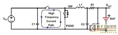 BQ24133 實(shí)質(zhì)是一個(gè) Buck 回路。也有類似的問(wèn)題。請(qǐng)看圖 3,BQ24133 工作原理圖,輸入電容C1,整流管開(kāi)通,續(xù)流管關(guān)斷,整流管電感和負(fù)載構(gòu)成一個(gè)高頻回路,有很高的 dI/dT。另外,整流管關(guān)斷,續(xù)流管開(kāi)通時(shí),電感電流通過(guò)續(xù)流管續(xù)流(在重載時(shí)續(xù)流管工作在電感電流連續(xù)模式), 電感電流沒(méi)有減小到零時(shí)整流管又會(huì)開(kāi)通,這是續(xù)流管被強(qiáng)制加反向電壓而截止,產(chǎn)生很高的反向恢復(fù)電壓尖峰(雖然是同步整流,由于死區(qū)的存在,死區(qū)時(shí)間內(nèi)仍然是二極管整流),這會(huì)導(dǎo)致比較大的共模噪聲,所以需要在 SW 對(duì) PGND 加 Snubber 電路來(lái)抑制續(xù)流管的反向尖峰。因此,輸入濾波電容 C1、電感 L1 和輸出濾波電容 C2 應(yīng)盡量靠近芯片布置,減小高頻回路面積。功率回路走線應(yīng)走大銅皮寬走線,減小諧波阻抗,最好都布置在 PCB 的同層,Snubber 放置在緊靠下管的位置。