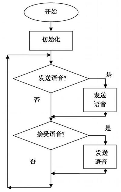 1.系統(tǒng)上電,打開(kāi)系統(tǒng);2.進(jìn)行初始化。對(duì)8051的定時(shí)器time2、PWM輸出端口、ADC轉(zhuǎn)換器、RADIO、SPI接口和無(wú)線收發(fā)模塊nRF2401進(jìn)行初始化;3.判斷是否要發(fā)送語(yǔ)音信號(hào),如果有則發(fā)送,然后進(jìn)入步驟4;4.如果沒(méi)有語(yǔ)音發(fā)送,則判斷是否要接收語(yǔ)音信號(hào)。如果有,則接收,然后進(jìn)行步驟3;5.如果沒(méi)有語(yǔ)音接收,則重新進(jìn)行步驟3.