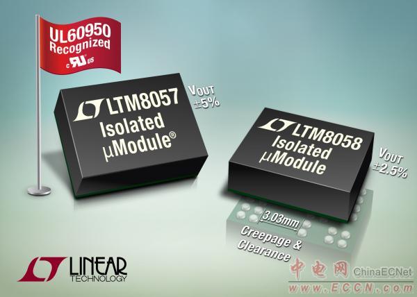 Linear推出 1.5W 輸出 µModule® ( 微型模塊) DC/DC 轉(zhuǎn)換器 LTM8057 和 LTM8058,這兩款器件提供 2kV AC 電氣隔離 (生產(chǎn)測試至 3kV DC),采用 9mm x 11.25mm x 4.92mm BGA (球珊陣列) 封裝。LTM8057 和 LTM8058 含有一個(gè)隔離式變壓器、控制電路、功率開關(guān)和容量適度的輸入及輸出電容。這兩款 µModule 轉(zhuǎn)換器是經(jīng)過 UL60950 認(rèn)證的組件,符合 #464570 文件要求。兩款器件都在 3.1V 至 31V 的輸入電壓范圍內(nèi)工作,在副邊提供穩(wěn)定的輸出電壓,電壓可調(diào)在 2.5V 至 12V (LTM8057) 和 1.2V 至 12V (LTM8058) 范圍。LTM8058 含有一個(gè)低噪聲線性后置穩(wěn)壓器,在 300mA 時(shí)將輸出紋波降至 20µVRMS。在等級 2 污染環(huán)境*中,爬電距離和電氣間隙支持高達(dá) 250V 工作電壓,以在測試儀器、服務(wù)器、工業(yè)自動(dòng)化、控制以及伺服系統(tǒng)中斷開接地環(huán)路。