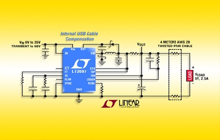 LT3697 采用了一個(gè)高效電源開(kāi)關(guān),并與必要的振蕩器、控制和電纜補(bǔ)償電路一起集成在單顆芯片中。內(nèi)部電纜補(bǔ)償具有可編程性以適應(yīng)電纜的長(zhǎng)度和線徑,雙路輸入反饋在故障情況下提供了一個(gè)額外的保護(hù)級(jí),從而可進(jìn)一步地保護(hù) USB 器件。該器件的其他特點(diǎn)包括一個(gè) FLT 標(biāo)記、短路和熱保護(hù)。