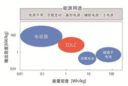 EDLC是蓄電裝置的一種,具備與鋰離子電池等二次電池相比,能量密度(單位面接的蓄電量)較差、但輸出密度(單位時(shí)間能處理的電量)較好的特征。另外,還具有反復(fù)充放電導(dǎo)致的性能劣化少(壽命長(zhǎng))、即使外部短路也不會(huì)產(chǎn)生故障(安全)、組成材料不含重金屬(環(huán)保)等優(yōu)勢(shì)。