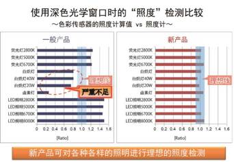 實現(xiàn)業(yè)界最高的紅外線過濾特性,將紅外線的影響降到以往產(chǎn)品的1/10以下,從而可有效提取出可視光。使用設(shè)計 自由度更高的深色光學(xué)窗口也可檢測可視光,從而可在不同照明情況下,更準(zhǔn)確地計算出照度和色溫。