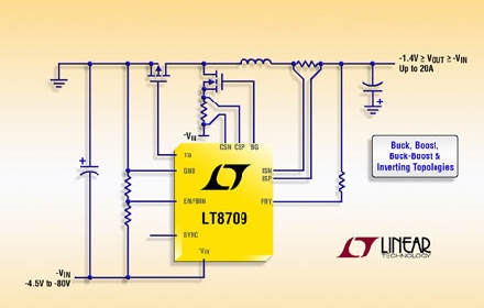 Linear推出適用于負至負或負至正 DC/DC 轉(zhuǎn)換的同步 PWM 控制器 LT8709。該器件無需復(fù)雜的電平轉(zhuǎn)換電路,就能夠獨特地解決相對于系統(tǒng)地的負電壓的調(diào)節(jié)問題。LT8709 的同步工作意味著,一個高效率 P 溝道 MOSFET 取代了輸出二極管,因此提高了效率,允許更大的輸出電流 (高達 20A),而且無需中到大功率應(yīng)用通常所需的散熱器。LT8709 可配置為降壓、升壓、降壓-升壓和負輸出拓撲,從而使該器件高度通用以適用于多種電源設(shè)計。