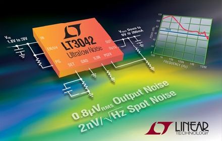 Linear推出領先的超低噪聲、超高電源紋波抑制 (PSRR) 低壓差電壓線性調節(jié)器 LT3042。該器件獨特的設計具有僅為 2nV/√Hz (在 10kHz) 的超低點噪聲和 0.8µVRMS 的積分輸出噪聲 (在 10Hz 至 100kHz 的寬帶寬內)。低頻和高頻 PSRR 性能是異常出眾。低頻 PSRR 超過 90dB (直到 10kHz),而高頻 PSRR 則超過 75dB (直到 3MHz),可使噪聲或高紋波輸入電源變得 “安靜”。LT3042 運用了 LTC 的專有 LDO 架構,即在一個高精度電流源基準之后布設一個高性能單位增益緩沖器,從而可產生幾乎恒定的帶寬、噪聲、PSRR 和負載調節(jié)性能,這與輸出電壓無關。此外,該架構還允許把多個 LT3042 并聯(lián)起來使用,以進一步降低噪聲、增加輸出電流和在印刷電路板 (PCB) 上散播熱量。