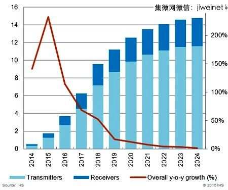 IHS對全球無線電源接收器與發(fā)射器市場出貨量的預測