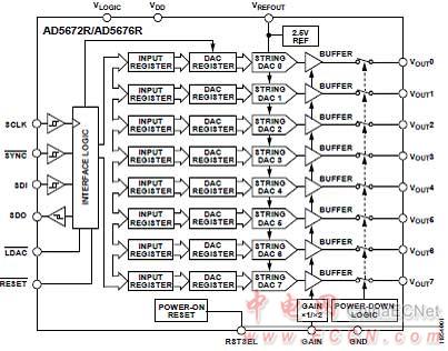 AD5672R/AD5676R采用多功能串行外設接口(SPI),時鐘速率最高達50 MHz,并均包含一個為1.8 V/3 V/5 V邏輯電平準備的VLOGIC引腳。