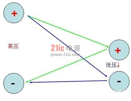 上圖是不共地情況下,左邊高壓的正負(fù)端集聚正負(fù)電荷,根據(jù)電子學(xué)基礎(chǔ)理論庫倫定律,