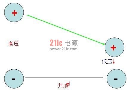 上圖為共地,當(dāng)把高低壓的負(fù)端共地連接之后,負(fù)端我們?cè)O(shè)為地端,注意這個(gè)地端是虛地,跟大地是不連接的,只是一個(gè)參考的公共端。對(duì)低壓的正端來說,因?yàn)榈蛪罕旧硎且粋(gè)電壓源,不受地端如何連接,低壓的正端相對(duì)于地端的電壓是不會(huì)變的,所以沒有影響。那么我們可以看到,只剩下高壓的正端對(duì)低壓的影響,而這個(gè)影響是單端的差模,因?yàn)闆]有了之前的高壓的負(fù)端的負(fù)作用,所以影響比較明顯。并且,一般的講,高壓端的電壓若有波動(dòng)的時(shí)候,那就對(duì)低壓的電壓也會(huì)產(chǎn)生波動(dòng)。